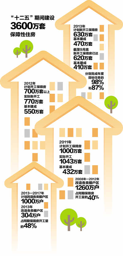 2013—2017年我国计划改造各类棚户区1000万户,其中今年改造各类棚户区304万户,占当年630万套保障房开工任务的48%。