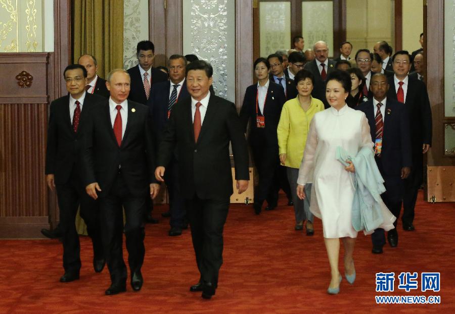 9月3日,纪念中国人民抗日战争暨世界反法西斯战争胜利70周年招待会在北京人民大会堂隆重举行。中共中央总书记、国家主席、中央军委主席习近平出席招待会并发表重要讲话。这是习近平和夫人彭丽媛同参加招待会的外国领导人共同步入宴会厅。新华社记者 刘卫兵 摄