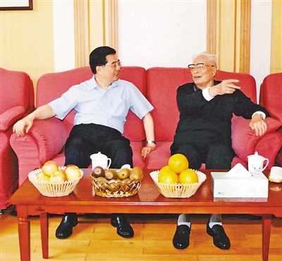 2006年8月,胡锦涛同志在北戴河看望张震同志。新华社 发
