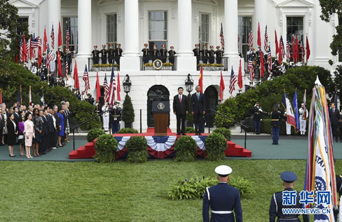 9月25日,美国总统奥巴马在华盛顿白宫南草坪举行隆重仪式,欢迎国家主席习近平对美国进行国事访问。记者 黄敬文 摄