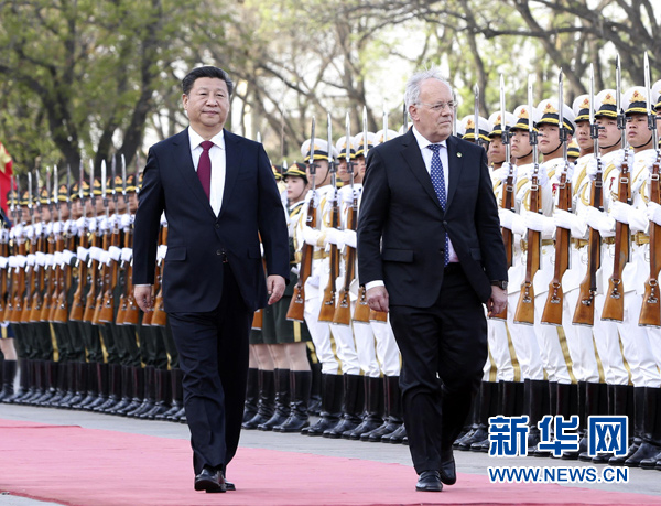 4月8日,国家主席习近平在北京人民大会堂同瑞士联邦主席施奈德-阿曼举行会谈。会谈前,习近平在人民大会堂东门外广场为施奈德-阿曼举行欢迎仪式。新华社记者 李学仁 摄