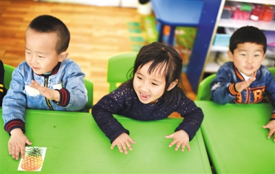 青海免费教育惠及各族学生。图为青海省黄南藏族自治州幼儿园小班教室内,藏族女孩夏央娜姆(中)和伙伴在课堂上。