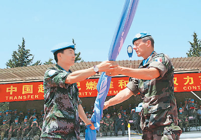 图为联合国驻黎巴嫩临时部队参谋长将联合国旗交到中国第16批赴黎维和部队指挥长黄云手中。