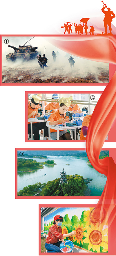 图①:“王杰班”所在连队官兵参加实兵演习。图②:广东省对口支援新疆喀什地区,使当地社会面貌发生深刻变化。图为新疆喀什伽师县广东思科拓展实业有限公司员工在生产线上工作。图③:近年来,陕西省持续开展汉江流域重点综合治理,汉江流域生态保护初见成效。图④:5月份以来,江苏省连云港市赣榆区青口镇组织大学生村官美术老师,在各社区空白墙面,以社会主义核心价值观为主题,手绘文明墙画。