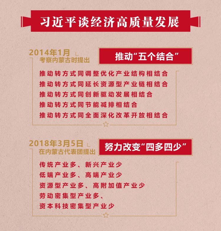 习近平首先提到要扎实推进经济高质量发展。内蒙古的传统产业以往被形象地总结为“羊、煤、土、气”。总书记在讲话中就专门引用了这个词。