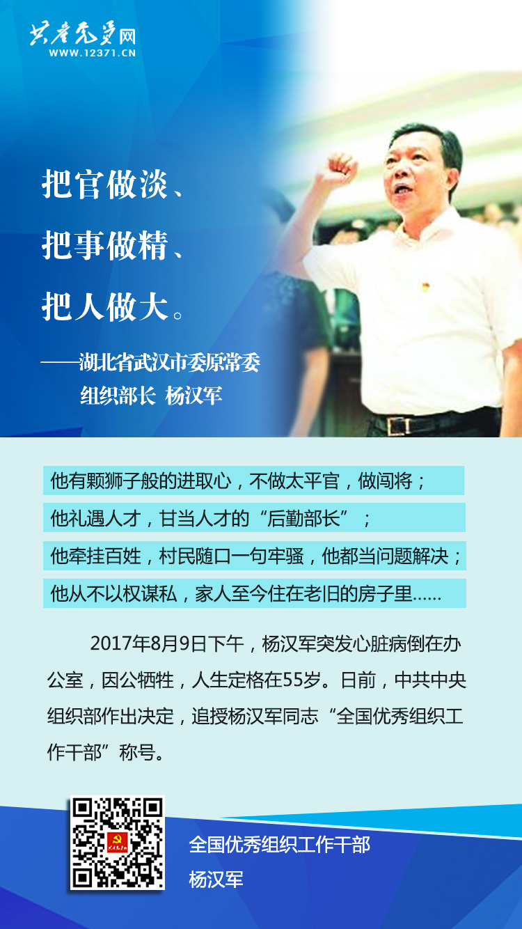 日前,中共中央组织部作出决定,追授湖北省武汉市委原常委、组织部长杨汉军同志“全国优秀组织工作干部”称号,并在组织系统广泛开展向杨汉军同志学习活动。